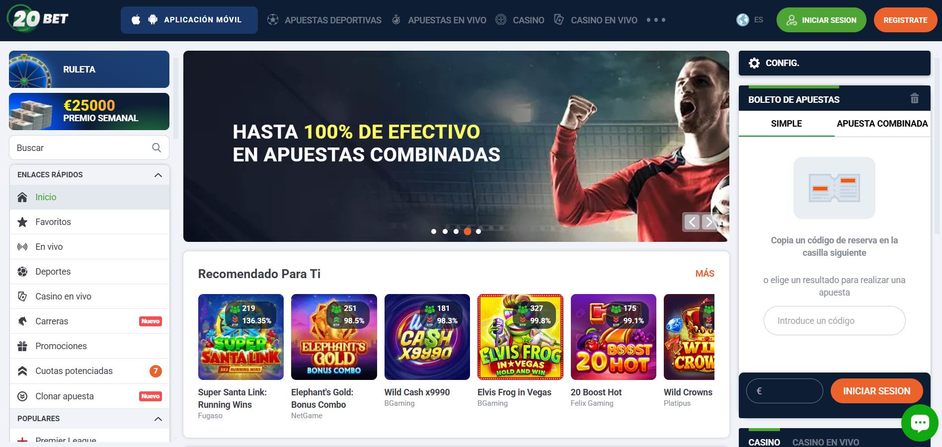 20bet se destaca por su interfaz distintiva y algunos aspectos únicos en su diseño. Su menú principal, ubicado en la parte superior de la página, ofrece pocas opciones directas pero incluye un icono de tres puntos para acceder a más funciones, logrando un equilibrio perfecto entre facilidad de uso y acceso rápido a diferentes secciones.