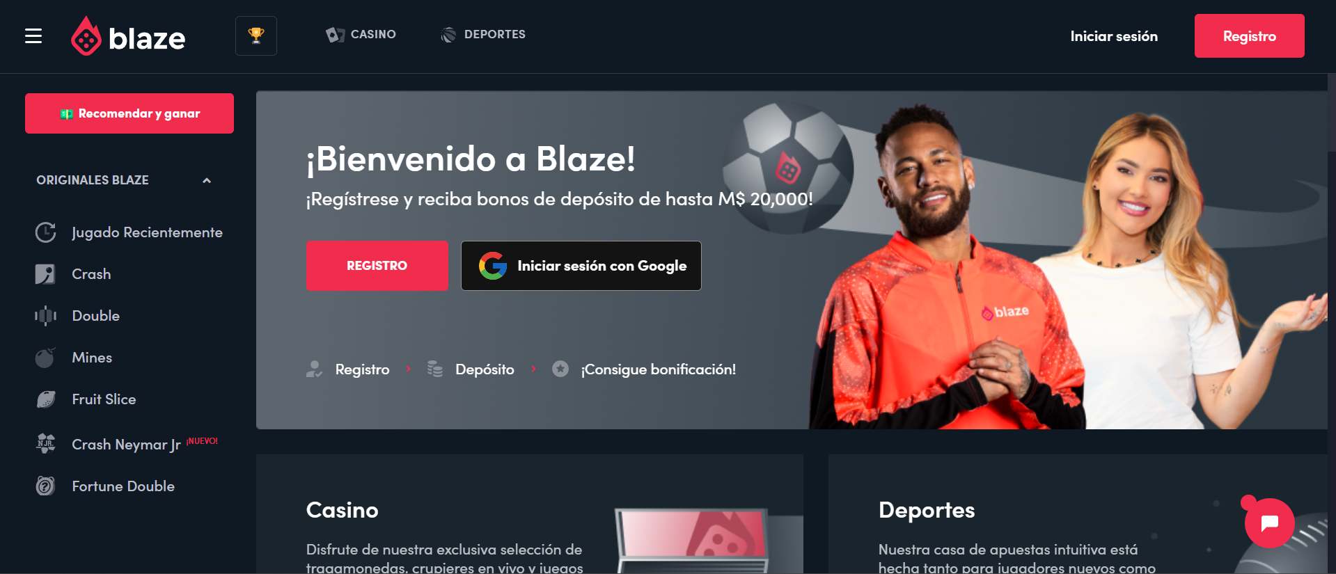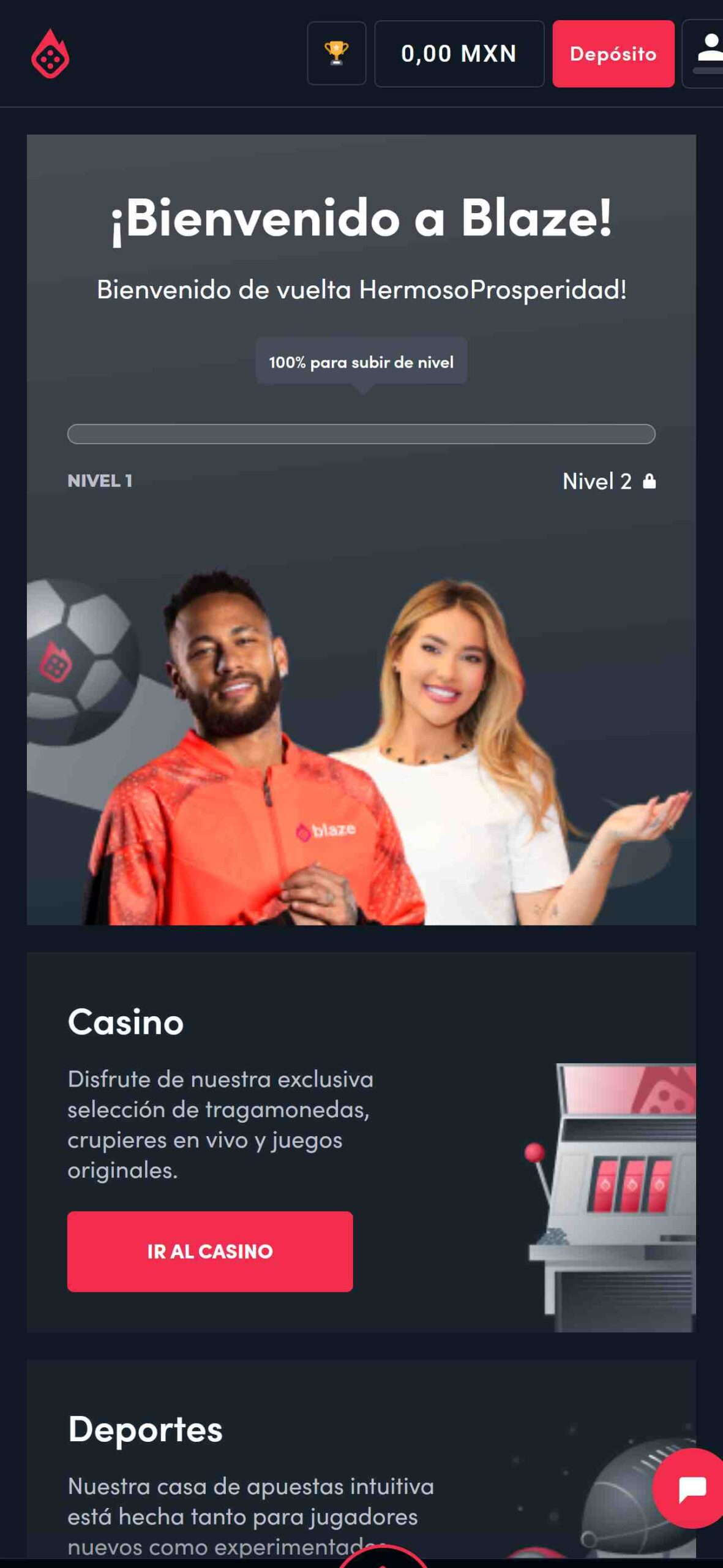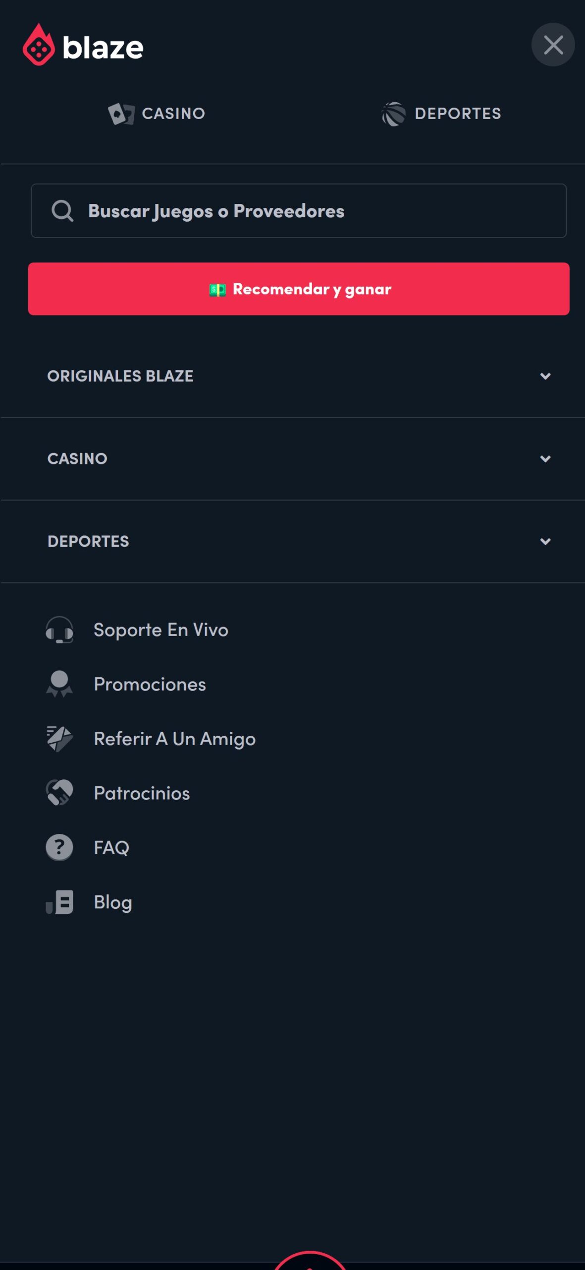 Blaze es una plataforma dual que contiene una gran sección de deportes y otra gran sección de casino y esto se evidencia en sus dos accesos superiores donde puedes pasar a la sección que estás buscando y hace más cómoda la experiencia de juego al mantener en pantalla únicamente elementos de la sección que te gusta.
