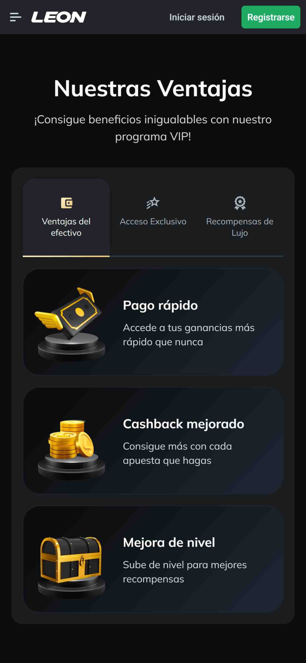 Valoramos especialmente tener también un espacio al final de la página principal donde el equipo de Leon describe algunas de sus ventajas y características. Sin embargo, lo que más llama nuestra atención es que Leon tiene presencia en redes como Facebook, Telegram e Instagram, lo cual te permite mantenerte informado de manera oportuna.