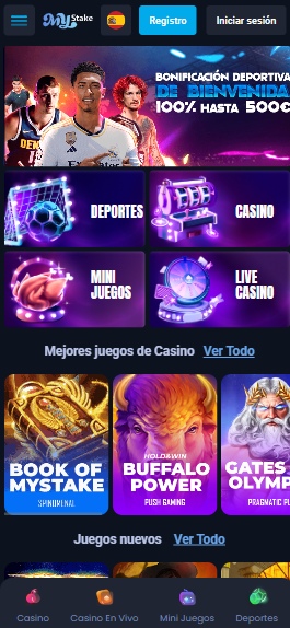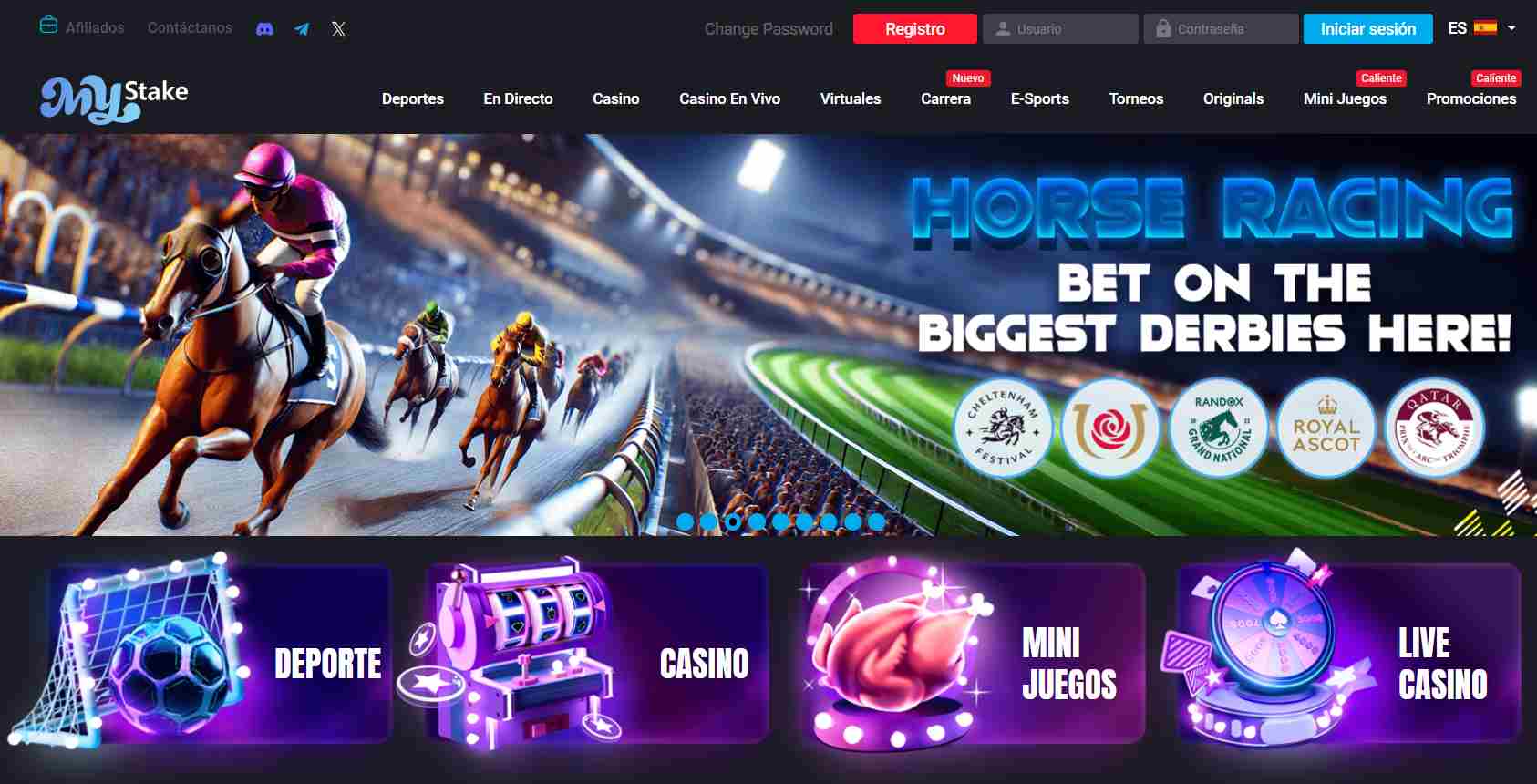 En el sitio web de Mystake veremos un menú principal en la parte superior con varias opciones que incluyen Mystake Casino con diversos juegos y también accesos sobre deporte.
