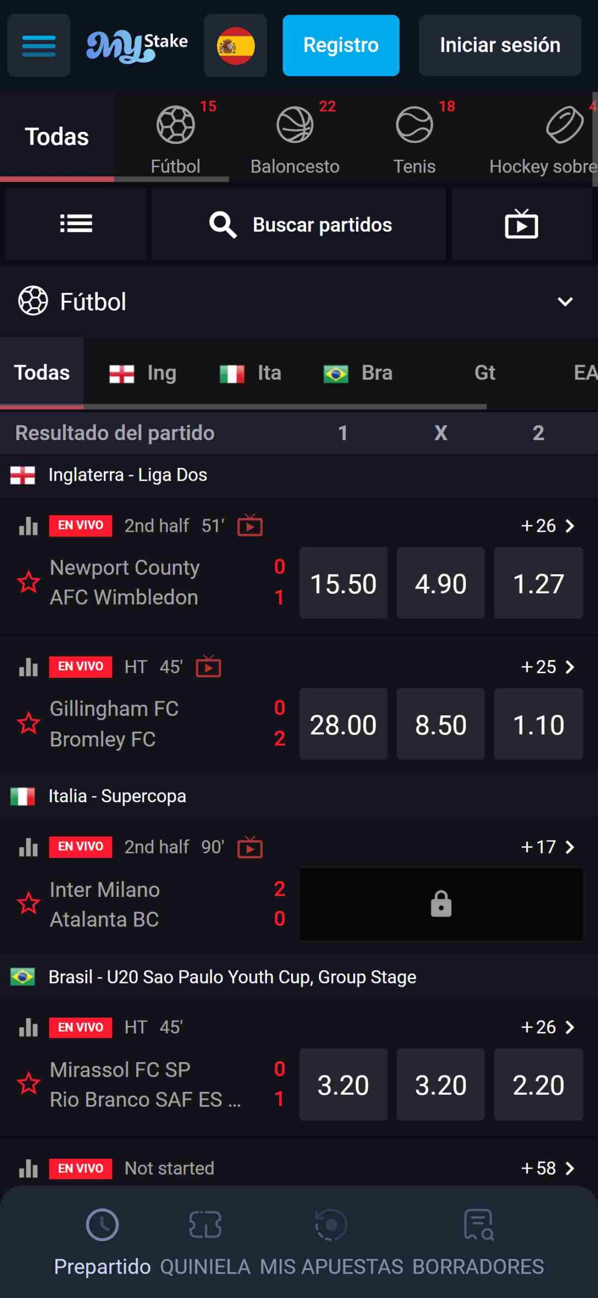 Al entrar a esta sección de Mystake verás los eventos que están en desarrollo pero también puedes prepararte un poco para las apuestas revisando los filtros de tiempo, donde se clasifican los partidos según el tiempo que falta para que comiencen.