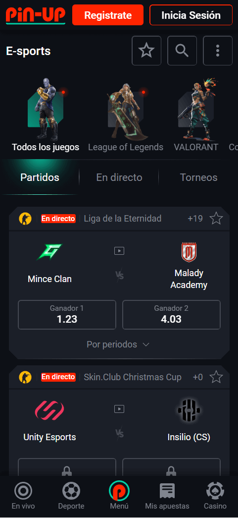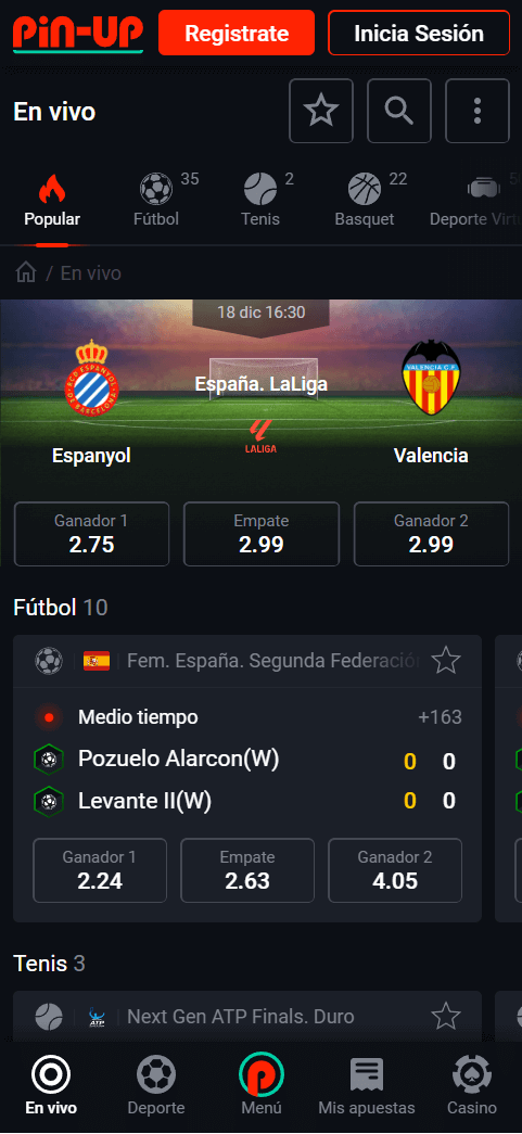 Si deseas vivir el momento en tiempo real, Pin-Up también tiene la opción de apuestas en vivo. Una vez entras a la sección de deportes de sitio oficial, la primera casilla de apuestas que te aparece es la del evento en directo de momento, así no pierdes el tiempo y te apuntas de inmediato.